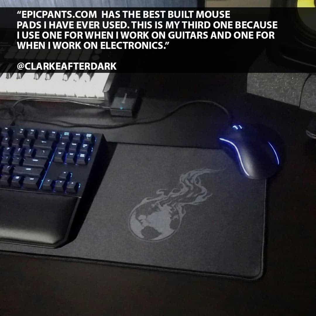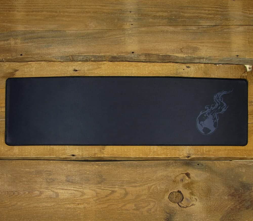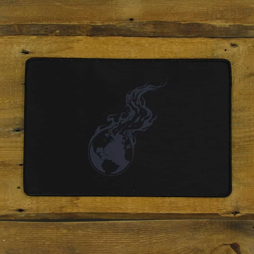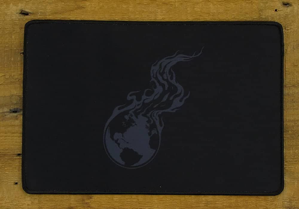 Our Burning Earth logo printed on a black mousepad or wide desk mat. It only gets more appropriate every year. The original idea was that knowledge is like a fire... so we should spread it... I guess that's a little cheesy. We really just wanted to watch the world burn one way or another.