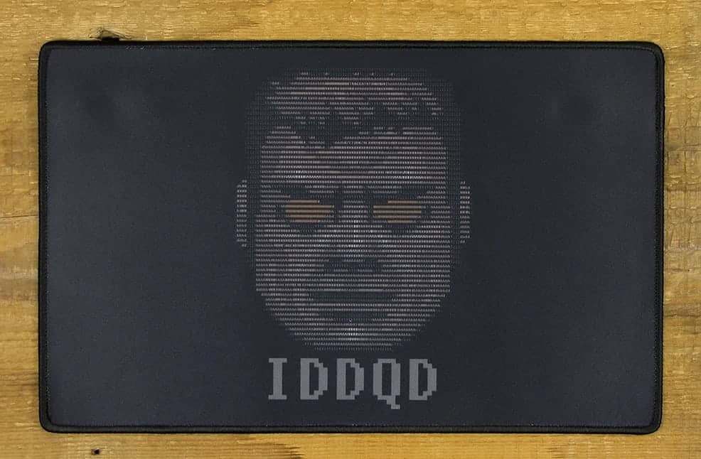 An ASCII art for the ultimate code: God Mode (IDDQD), printed on a black mousepad.