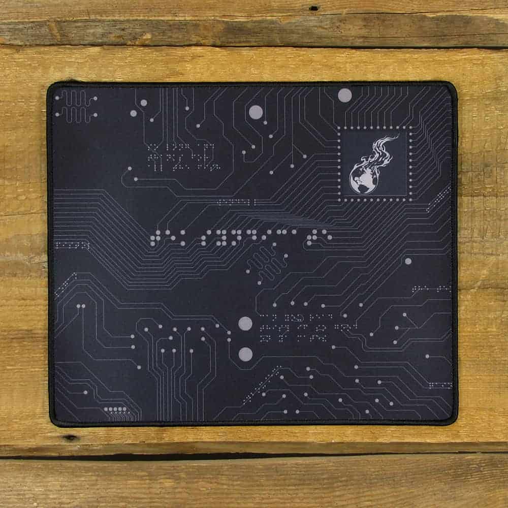 Check out our Tek Syndicate PCB design printed on a black mousepad. It’s got everything you need on a mouse pad: dots, lines, and a burning earth logo.